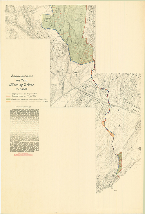 Kartet er utarbeidet etter stadfestelse av ny sognegrense mellom Ullern sogn og Vestre Aker sogn i 1938 (Herredstyresak 82/1938). Den opprinnelige grensen fra delingen av Vestre Aker sogn i 1906, er også inntegnet.