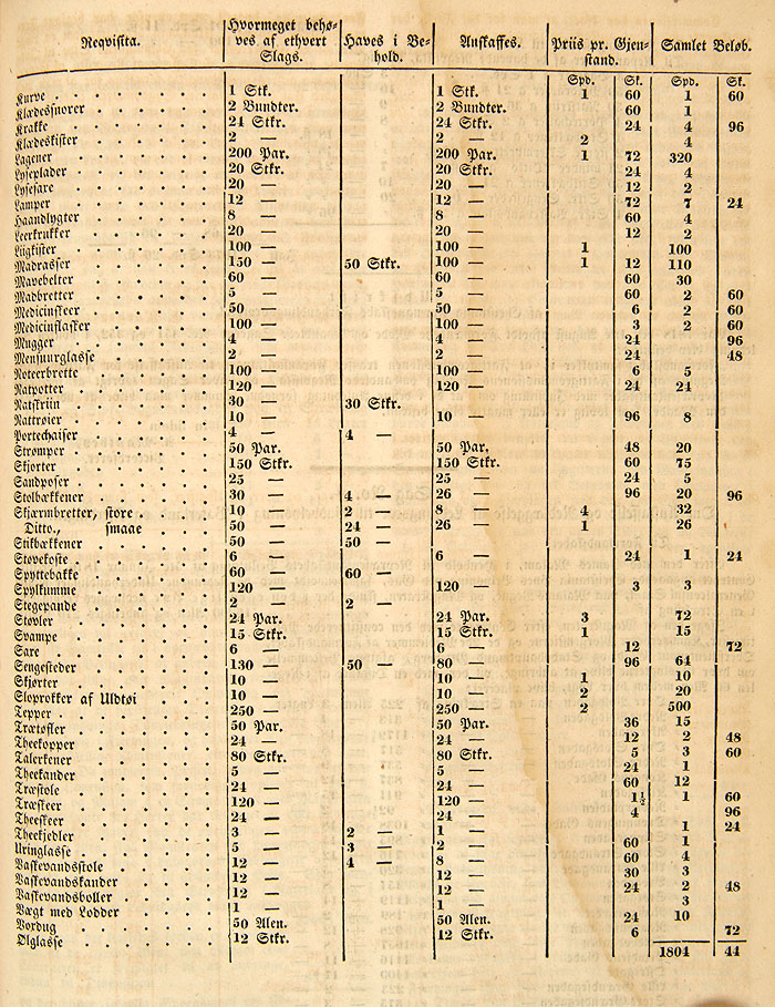 Utstyrsliste for kolera-lasarett 1848