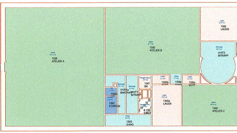 Det er tilgang til atelierene med både heis og trapp. Heisen er 220 cm høy og 135 cm bred.