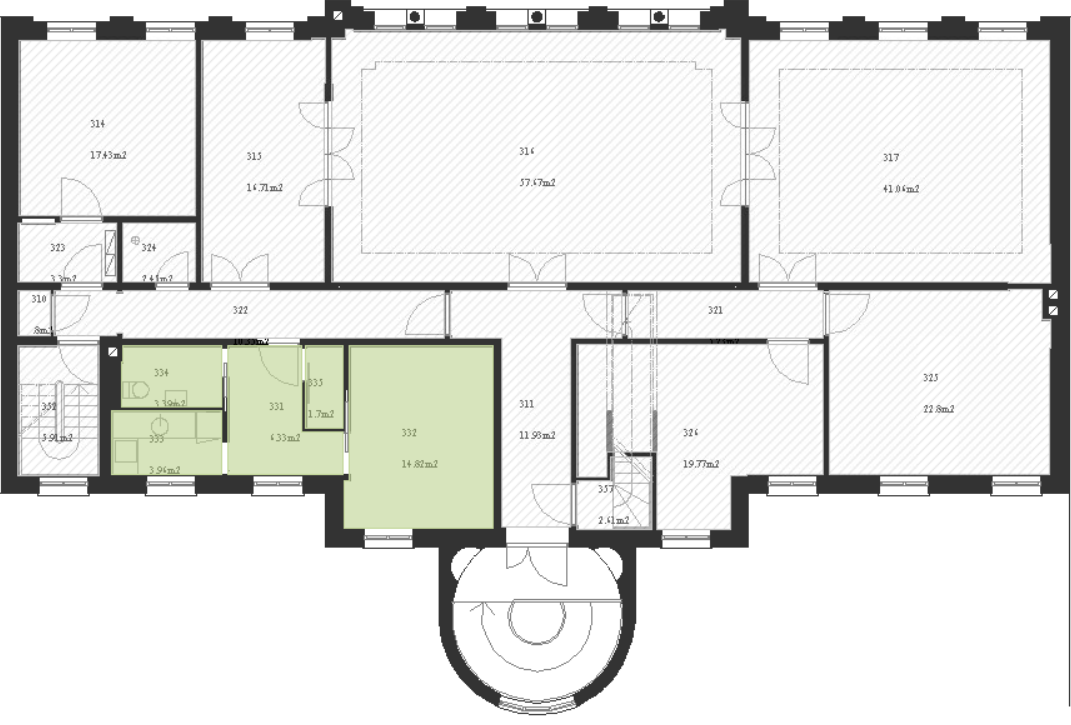Kunstnerboligen er en studioleilighet beliggende i byggets tredje etasje med tilknyttet atelier i byggets andre etasje.