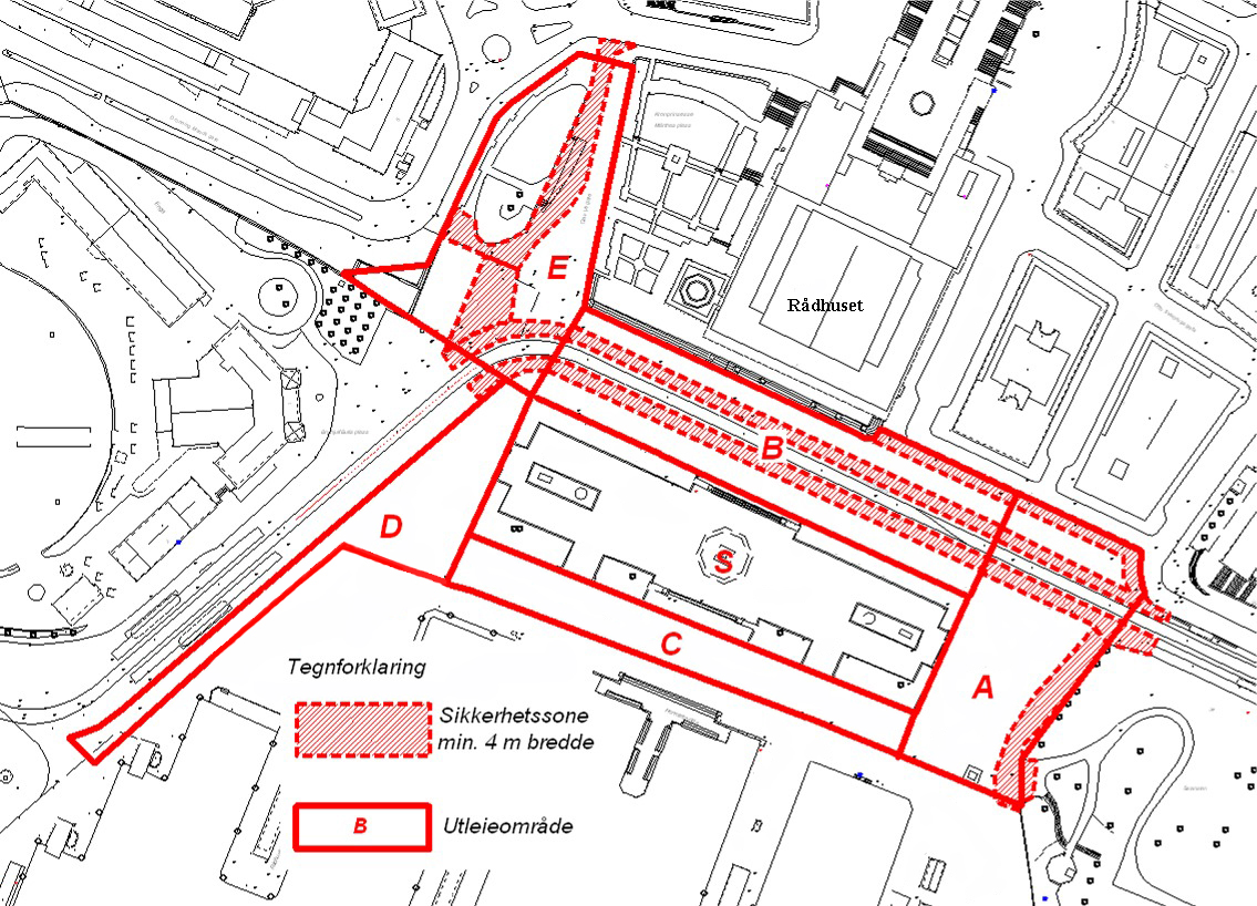 Rådhusplassen i feltene A, B, C, D og S leies ut til kun en arrangør av gangen. Felt E benyttes til utstillinger. Ved søknad om utstilling i felt E må eksempler på bildene som skal utstilles legges ved.