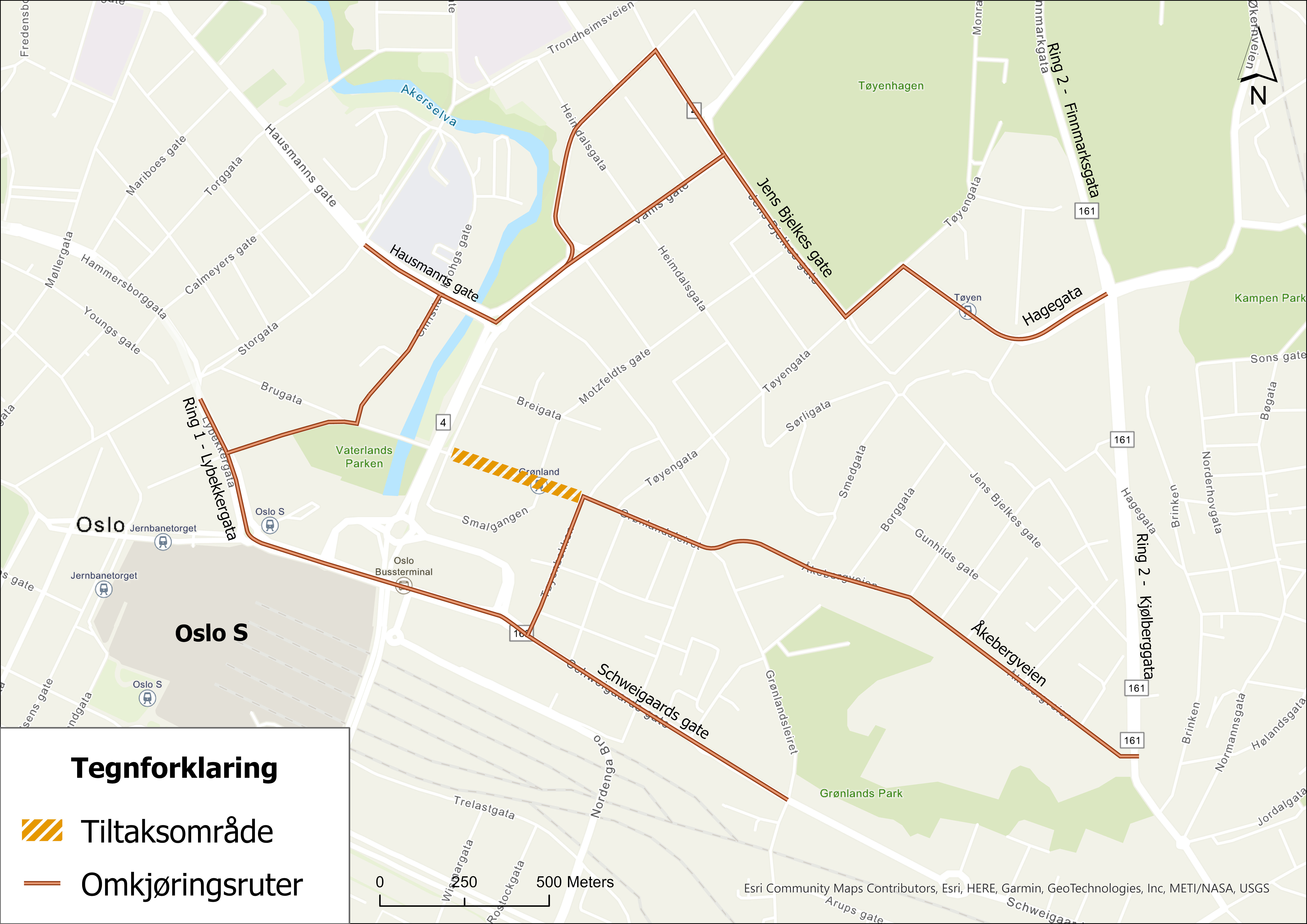 På strekningen Lakkegata til Motzfeldts gate ble det innført enveiskjøring i østgående retning, og bilkjøring ble forbudt på strekningen Motzfeldts gate til Tøyenbekken. Kjøreretningen i Motzfeldts gate, Breigata og Lakkegata ble snudd.