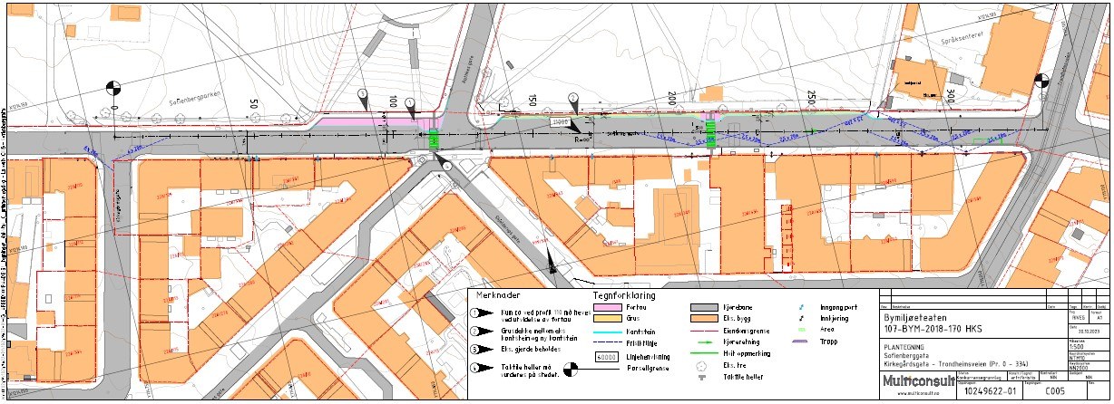 Sofienberggata enveisreguleres mot øst og som del av trafikksikkerhetstiltak i Sofienberggata erstatter skråstilt parkering med langsgående parkering og krysningspunkt for gående strammes inn.