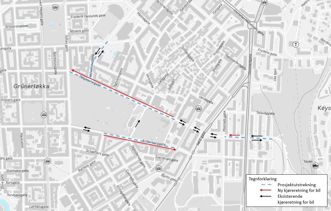 Som følge av enveisregulering i Helgesensgate vil det være nødvendig å endre kjøremønsteret i Sofienberggata, samt mindre trafikksikkerhetstiltak.