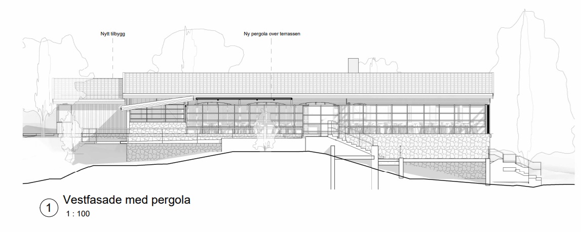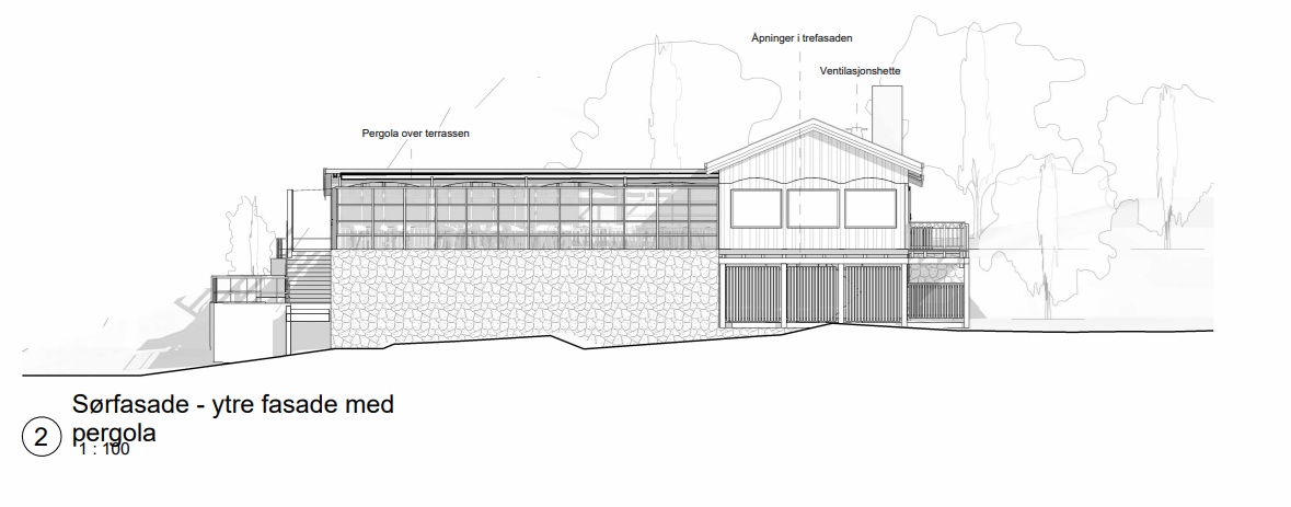 Det skal bygges en åpen pergolaløsning over deler av terrassen. Eksisterende levegg rundt terrassen, som er skjerming for vind og vær, skal tas ned og gjenbygges i tilsvarende omfang og konstruksjon. Fra terrassen åpnes den eksisterende trappen ned til kjelleretasjen opp. I kjelleretasjen vil det være ytterligere to gjestetoaletter, og inngang til teknisk rom.